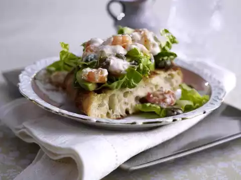 Mix prawns, avocado, salad and caper mayonnaise. Spread over the bread halves.