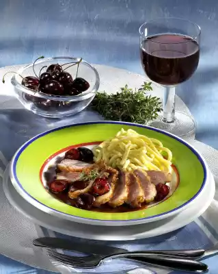 Bring to the boil and add the remaining thyme twigs. Cut duck breasts into slices, arrange on plates with the spicy cherry sauce and spaetzle.