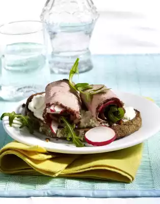 Put a slice aside for garnishing. Halve the remaining slices and sprinkle on the roast beef slices. Cover each roast beef with a leaf of rocket and roll up. Spread horseradish cream on the bread.