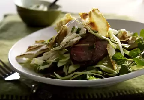 Cut the fillet into slices and fold into the salad. Season salad again. Pluck the flat breads into small pieces. Fry in a pan without oil for 2-3 minutes and arrange with the salad. Garnish with mint.