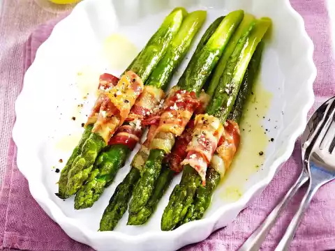 Halve the bacon slices crosswise. Wrap 1/2 slice of bacon around each asparagus spear. Heat oil in portions in a frying pan. Fry the asparagus for about 4 minutes while turning. Remove and keep warm