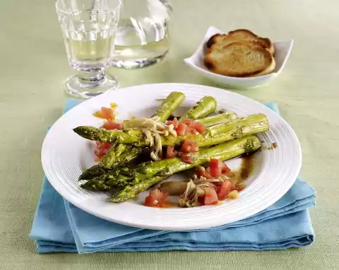 ##Asparagus## Wash it, cut the woody ends off. Heat 1 tablespoon of oil in a pan. Fry the asparagus for approx. 5 minutes, turning them over. Season with soy sauce, broth, pepper and honey. Wash and clean the tomatoes, cut them crosswise.