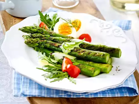 Wash the asparagus and cut the ends off generously. Clean and wash the tomatoes and arugula. Halve or quarter the tomatoes. Boil eggs for about 8 minutes until hard.
