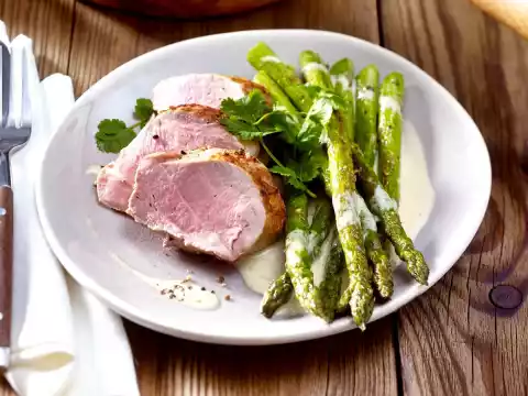 Take the meat out of the oven and let it rest for about 5 minutes. Cut fillet into slices and arrange with asparagus and sauce, garnish with coriander.
