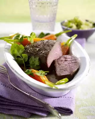 Arrange the meat and carrots with the remaining coriander on a plate. Season with coarse pepper. Add couscous.