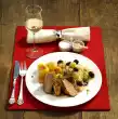 Wash the legs of duck and pat dry well. Peel onions and cut into two quarters. Wash, peel and chop the carrots. Heat the oil in a frying pan and fry the duck legs on both sides. Season with salt, cayenne pepper and thyme. Add the carrots and onion slices and roast in an open roaster in a preheated oven (electric stove: 200°C/ gas: level 3) for 1-1 1/4 hours. After approx. 30 minutes pour on 1/4 litre of stock. Clean, quarter and wash the red cabbage. Cut out the stalk and cut the quarters into strips. Wash and quarter the pears, remove the core and cut half of the quarters into thin slices. Cut remaining quarters lengthwise into slices and sprinkle with lemon juice. Dice remaining onion. Heat clarified butter in a pot and fry onion until transparent. Add red cabbage, braise briefly and deglaze with pear juice, 1/8 litre water and vinegar. Season with salt and pepper. Add cloves, laurel and pear slices. Cover and stew for about 1 hour. Add remaining pear slices to the red cabbage about 10 minutes before the end of the cooking time. Remove the finished duck legs from the roaster and keep warm. Dissolve roast with remaining stock and cream. Pour through a sieve into a pot. Bring to the boil and stir in the sauce thickener. Bring to the boil again briefly. Season to taste with salt and pepper. Arrange the duck legs on the red cabbage. Serve sauce extra. Serve with boiled potatoes or potato noodles