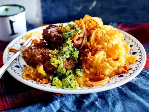 Fry the onions in hot frying fat until they are glassy and turn until the crumbs are golden brown. Arrange the meatballs with onions, puree and relish.
