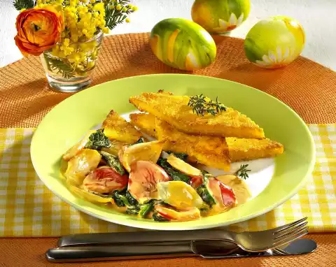 Deglaze with 100 ml water and cream. Let simmer for 5 minutes. Wash thyme, dab dry and pluck leaves from the stalks, except some for garnishing. Cut polenta into rhombuses. Heat 2 tablespoons of fat in a frying pan and fry the polenta rhombs in it for about 3 minutes on each side until golden brown. Add thyme to the vegetables and fold in. Arrange polenta rhombs and vegetables. Garnish with thyme