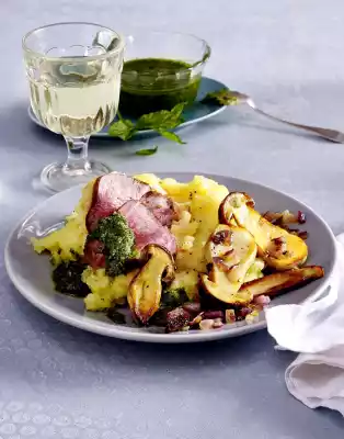 Cut the meat into slices. Arrange mashed potatoes with meat and porcini mushrooms, drizzle with some pesto.