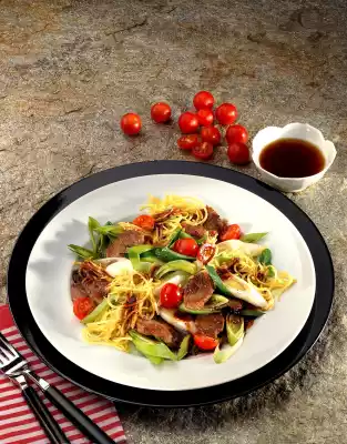 Dab meat dry and cut into thin strips. Heat oil in a wok. Stir-fry the meat for about 5 minutes. Season with salt and pepper. Remove from the wok. Fry the leek in the cooking fat for 3-5 minutes.
