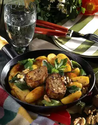 Fry the potatoes and spring onions in the frying fat for about 5 minutes while turning them over. If necessary, wash thyme, pluck off leaves and add. Season with salt and pepper. Add meat again. Sprinkle everything with nuts. Garnish with parsley. Serve with a tomato salad