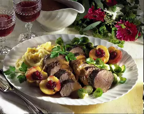 Fill the apple halves with 1 teaspoon of cranberries each. Cut the meat into slices and arrange on a large plate with celery puree, Brussels sprouts and stuffed baked apples. Pour some sauce over the meat and serve garnished with parsley.