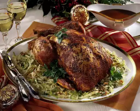 Keep the finished turkey warm, pour the stock through a sieve into a small pot. Bring the stock to the boil, stir in the sauce thickener and bring to the boil again briefly. Refine the sauce with cream and season with pepper, soy sauce and possibly some sugar. Mix walnuts and herbs into the white cabbage and season with soy sauce and cayenne pepper. Arrange the turkey on the white cabbage and serve garnished with parsley. Serve with sauce extra. A wild rice mixture tastes great with it