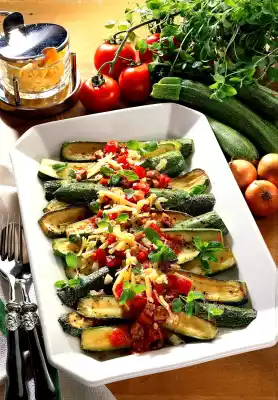 Clean, wash and cut the zucchini lengthwise into thick slices. Heat the remaining oil in a frying pan and fry the zucchini in two portions. Season with salt and coloured pepper and place on a plate.