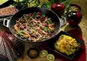 Heat a tablespoon of oil in a frying pan and fry the meat vigorously. Add the onions and tomatoes, braise briefly and add 200 millilitres of water. Add marjoram, season with salt and pepper and simmer for five minutes.