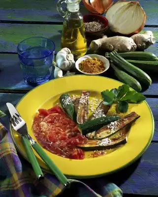 Add tomatoes with juice and coconut cream. Mash tomatoes with a fork. Bring to the boil and let it thicken for about 10 minutes. Season to taste with salt. Clean and wash the zucchini and cut them in half lengthwise.