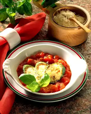 Arrange the tomato vegetables in 4 ovenproof dishes. Place zucchini slices on top and sprinkle with the cheese. Bake under the hot grill of the oven. Garnish with basil.