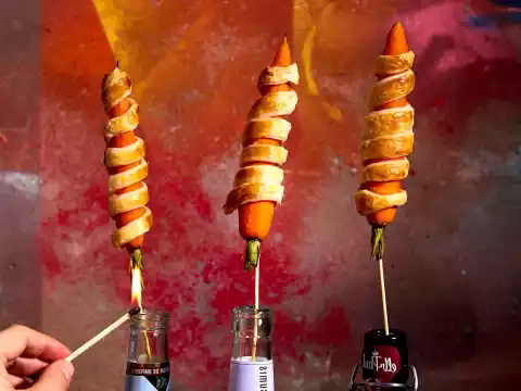 Roll 1 roll (270 g) of puff pastry (refrigerator shelf). Cut lengthwise into 16 strips. Peel and wash 16 carrots and wrap each with 1 strip of dough. Place on a baking tray lined with baking paper. Whisk 2 egg yolks and 5 tbsp.