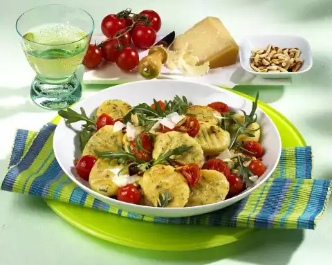Heat olive oil in a large pan, add tomatoes and gnocchi and fry briefly while turning. Season with pepper and fold in rocket. Serve on plates sprinkled with Parmesan shavings and pine nuts.