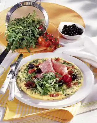 Slide the omelette onto a plate. Top with mortadella and the rest of the rocket. Garnish with cherry tomatoes and olives if desired. Tastes good with farmhouse bread
