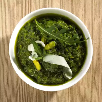 Wash the rocket, dab dry well, clean and chop coarsely. Peel garlic and chop coarsely. Grate pecorino finely. Finely mash the rocket, garlic, cheese and pistachios in the universal chopper.