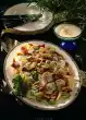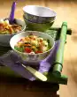Clean and wash the salad and cut into fine strips. Clean, wash and cut the bell peppers into pieces. Peel onion and cut into thin slices. Wash 2 lemons hot and cut into slices.