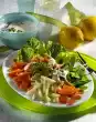 Squeeze the rest of the lemon. Mix lemon juice, salt and pepper. Whip the oil into the mixture. Carefully mix the vinaigrette into the salad ingredients.