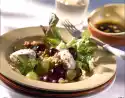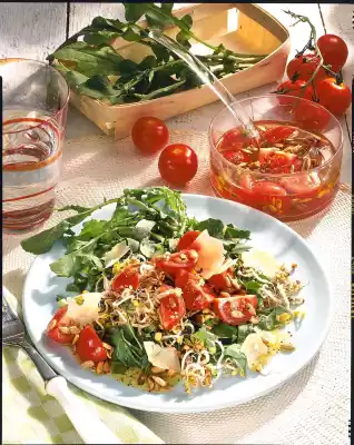 Wash and drain the sprouts as well. Cut the rocket, except for a few young leaves for garnishing, into strips and mix with the sprouts. Arrange the lettuce on plates and spread the tomato vinaigrette on top. Sprinkle with sliced Gouda and serve garnished with rocket