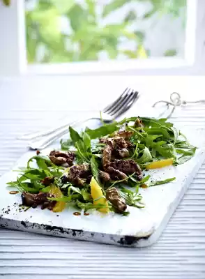 Sort the salad, wash and spin dry. Put the meat in a sieve and let it drip off. Collect the marinade. Heat 1 tablespoon of oil in a pan. Add the meat and fry vigorously for approx. 3 minutes, turning. Deglaze with the marinade and season with salt and pepper. Mix salad and orange filets and serve. Add meat strips