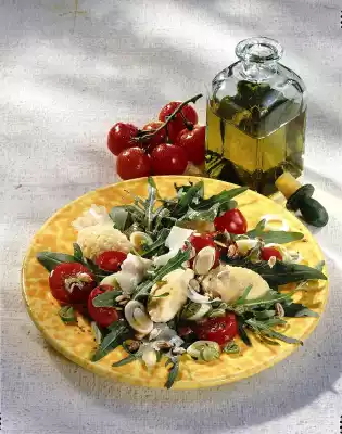 Form cams from the dough with two moistened teaspoons and let them simmer in slightly boiling salted water for about 10 minutes. Clean the rocket, wash and pat dry. Clean, wash and halve or cut tomatoes and spring onions into fine rings. Whisk olive oil, vinegar and 2 tablespoons of water. Season to taste with salt, pepper and sugar. Take millet dumplings out of the water and let them drip off on kitchen paper. Lightly roast sunflower seeds in a pan without fat. Mix the salad ingredients with the vinaigrette. Arrange the dumplings on top of the vinaigrette.