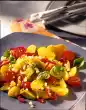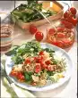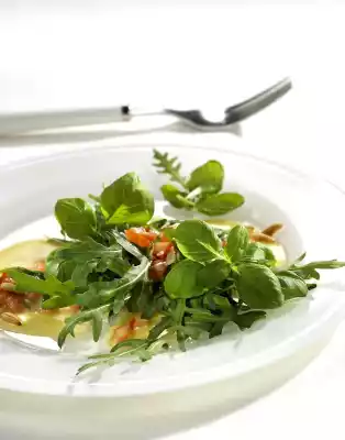 Season with salt, pepper and sugar, leave to stand for about 1 hour. Shortly before serving, clean and wash the rocket salad, if necessary cut it a little smaller. Roast pine nuts in a dry pan. Serve the rocket with the vinaigrette and the pine nuts. Serve garnished with fresh basil