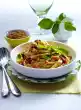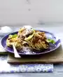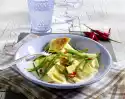 Clean and wash the vegetables. Cut leek and sugar snap peas into fine strips. Halve the zucchini and cut into diagonal slices. Peel garlic and chop finely. Heat oil in a pan.