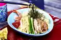 Clean and wash the sugar snap peas, cut lengthwise into fine strips and cook in boiling salted water for about 2 minutes. Pour into a sieve, rinse cold and drain. Mix Sour Cream with 50 g goat cheese in a bowl.