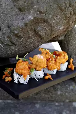 Heat the oil in a wide pot to approx. 180 °C (it is hot enough as soon as bubbles rise from a wooden skewer). Rinse shrimps cold, dab dry and pull through the temperature dough with a fork. Fry in hot oil for 3-4 minutes, turning occasionally. Drain briefly on kitchen paper, mix while still hot with the mayonnaise so that it melts. Serve immediately on one Sushi each