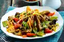 Cover a bamboo mat with cling film. Halve the nori leaf lengthwise. Wash the cucumber, halve lengthwise, remove seeds and cut into thick sticks. Cut avocado in half, remove stone, peel fruit halves and cut into slices