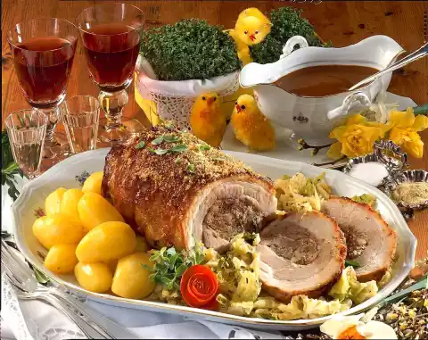Season with salt and pepper. Peel and wash the potatoes and cook in salted water for about 20 minutes. Remove roast from the fat pan. Pour frying stock through a sieve and bring to the boil. Stir flour and some cold water until smooth, add to the sauce and bring to the boil again.