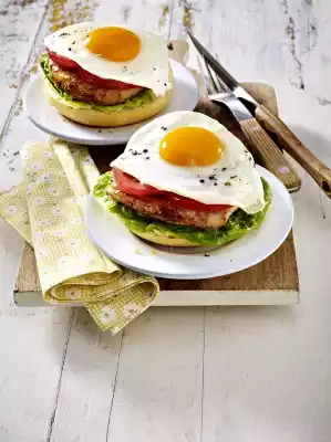 In the meantime cut the rolls in half horizontally. Brush the cut surfaces with butter. Remove meat from the pan. Place lettuce, meat, tomatoes and fried eggs on the rolls one after the other. Arrange on plates