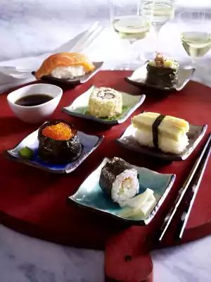 Form 16 balls from some cooked sushi rice and flatten them into round talers of approx. 4 cm Ø and approx. 1-1 1/2 cm high. Dip hands in vinegar water in between. Coat the talers with a little wasabi.