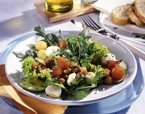Mix the rocket, lettuce, melon, mozzarella, zucchini, shallots and mushrooms with the caramelized vinaigrette and arrange on four plates. Serve garnished with chervil as desired.