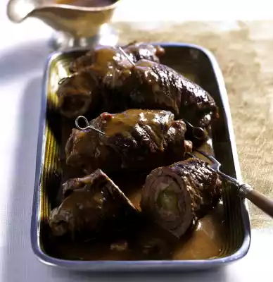 Place 2 strips of bacon, 1 onion quarter and 2 cucumber quarters on each roulade. Roll up the roulades firmly and pin them with roulade needles. Heat lard in a roaster. Fry the roulades in it all around.