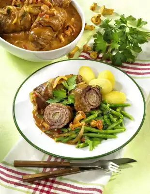 Boil up while stirring. Stir the chanterelle mixture into the sauce, season to taste again. Put the roulades back into the sauce. Drain the beans. Melt 1-2 tablespoons butter. Swirl the beans and the remaining chopped parsley in it. Arrange everything garnished with parsley. Boiled potatoes taste good with it