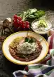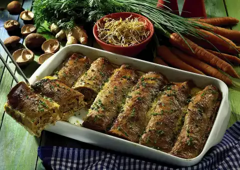 Mix 3 eggs, 1/4 litre milk, salt and flour and let it swell for 30 minutes. Peel, wash and finely grate the carrots. Turn out the stalks of the mushrooms. Wash and chop the mushroom heads. Wash and drain the sprouts. Wash chives, dab dry and cut into small rolls. Heat oil in a pan and fry the chopped mushrooms in it. Add carrots and sauté. Season with soy sauce, salt, chilli and ginger. Fold in sprouts and chives, except for 1 tablespoon. Stir mineral water and baking powder into the dough. Heat the fat in portions in a pan and bake 6-8 pancakes from the dough. Spread the filling over the pancakes, roll them up and place them in an ovenproof dish. Mix the remaining eggs and milk. Season with salt and pepper and pour over the rolls. Bake in the preheated oven (electric cooker: 200 °C/ gas: level 3) for about 40 minutes. Serve sprinkled with chives