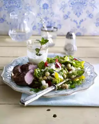 Spread some salad dressing in 4 glasses and garnish with mint. Cut lamb salmon into pieces and arrange on plates together with the glasses and the salad. Pour remaining mint sauce over the salad and serve immediately.
