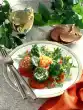Clean and wash the romaine lettuce and cut it into strips, except for a few leaves for dressing. Clean, wash and cut the tomatoes into six. Peel and finely chop the onion. Wash basil, dab dry and pluck the leaves from the stalk. Put two leaves aside for garnishing and cut the remaining basil into strips.