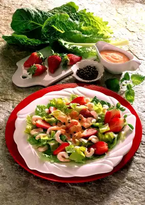 For the sauce, mix the mayonnaise with tomato ketchup and brandy. Season to taste with salt, pepper and sugar. Wash the strawberries, dab dry, clean and cut in half. Clean, wash and cut the romaine lettuce into narrow strips.