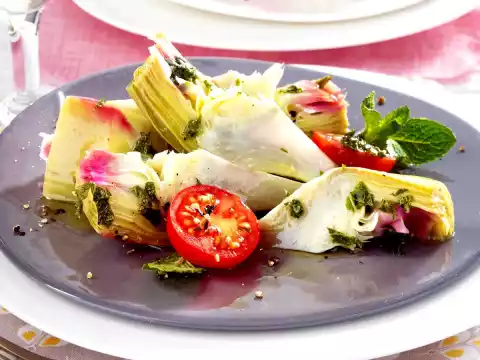 Remove the artichokes from the water, quench briefly and cut into six. Heat 3 tablespoons of oil in a frying pan. Sauté the artichokes for about 3 minutes. Season with salt and pepper. Add mint, vinegar and garlic and toss for 1-2 minutes. Arrange the artichokes on plates and drizzle with 1-2 tbsp. olive oil. Garnish with halved cherry tomatoes and mint. Roasted bread tastes good with it