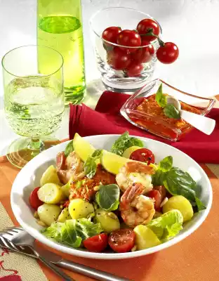Season scampi with salt and pepper. Remove from the pan. Meanwhile, wash the basil, dab dry and pluck the leaves from the stems. Mix potatoes, romaine lettuce, tomatoes, basil and scampi.