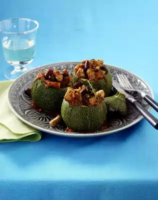 Wash and drain the Rondini, cut off the upper quarter with the stem base. Hollow out the fruit with a spoon. Clean, wash, drain and cut the spring onions into rings. Peel garlic and cut into small cubes. Wash, drain and dice the pepperoni. Thyme wash, dry dab us, except for something to garnish, pluck leaves from the stems and chop roughly. Drain the kidney beans
