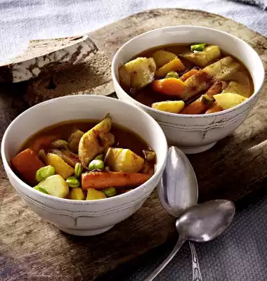 Heat oil and butter in a roasting pan. Fry onion, garlic and celery for about 4 minutes. Add prepared vegetables and mix everything together. Stew in a closed roaster for about 5 minutes. Season with cumin, coriander and chilli. Add the stock, bring to the boil and simmer for about 15 minutes