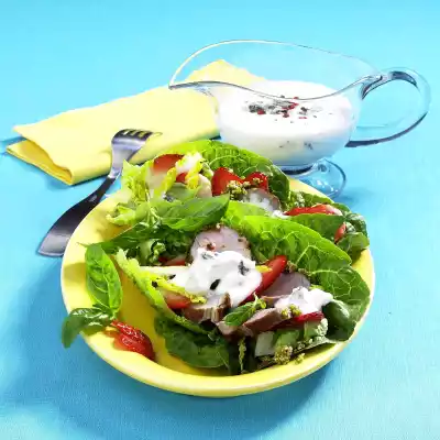 Mash cheese. Mix with yoghurt and sour cream. Season with salt, pepper and pink berries and pour over the salad.